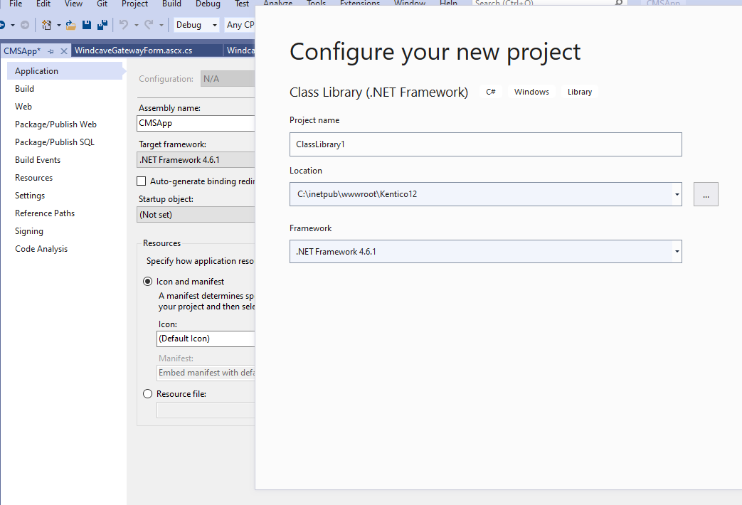 I configured my project’s target framework to be 4.6.1 as it’s the framework that the CMSApp project currently runs on (the one given by Kentico).