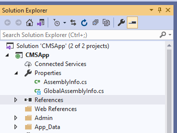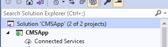 It says 2 of 2 projects because I am screenshotting after I’ve done some things (that I’ll explain now), but it should contain only CMSApp in the root folder (Solution ‘CMSApp’) at the moment.