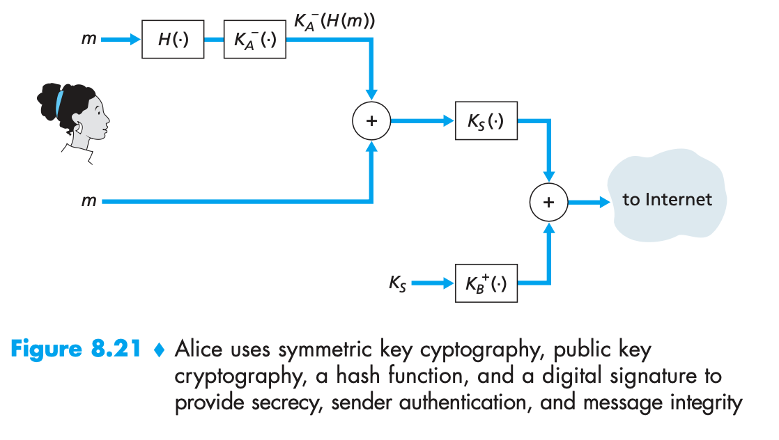 - Confidentiality: Ks is used for symmetric key system that encrypts message m.